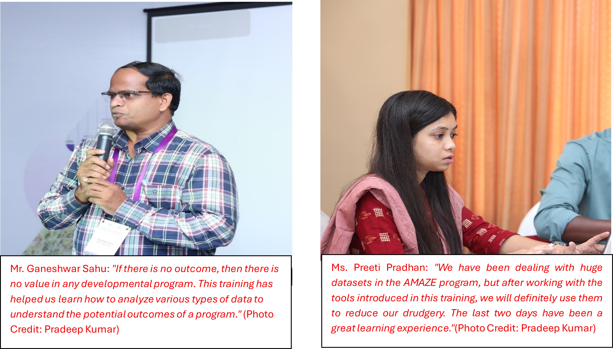 The training was designed with a balance of concept-building, tool-based demonstration, and peer-led exercises. Delivered by experts from IFPRI – Dr. Devesh Roy, Dr. Mamata Pradhan, Mr. Sunil Saroj, Mr. Abul Kamar and Ms. Vandana Vidhani – the sessions were interactive, exercise-oriented, and designed to enable immediate application.